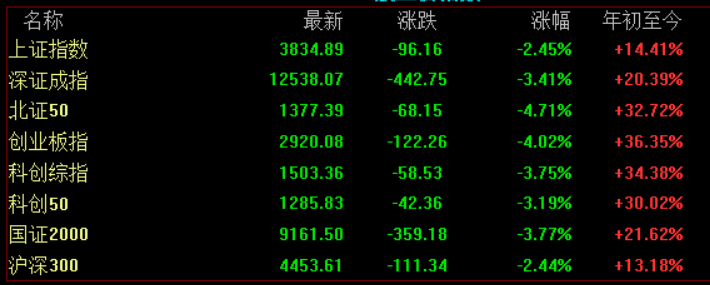 指数全线尽墨: 创业板指大跌4.02%,科创50跌超3%,深证成指跌幅也达到了3.41% 。